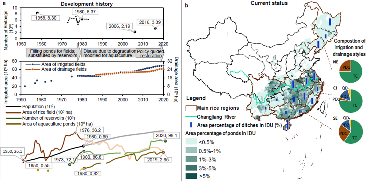 Ezpay杜耘、张亮团队,与中国农科院、华中农业大学、中科院重庆绿色智能研究院、加拿大滑铁卢大学及湖北、江西、辽宁省农科院等单位合作,系统调查了我国水稻灌排系统的开展历程及小水体利用现状,发现近几十年来由于填塘造田和自然损毁,我国稻区的水塘数量已大幅减少,现存水塘有的缺乏维护而淤积严重、有的改为精养渔塘,80%都不再参与水稻灌排(图1)。然而,基于前期建立的涵盖中国417个水体的数据集,团队发现相比于湖泊、水库等大型水体,小水体的氮磷截留能力更强。稻区小水体的减少和弃用,增加了水稻生产的清水消耗量和污水排放量,从而提高了水稻生产的水足迹。同时,过度依赖远距离水源的灌溉模式,也增加了稻田在干旱天气的减产风险。